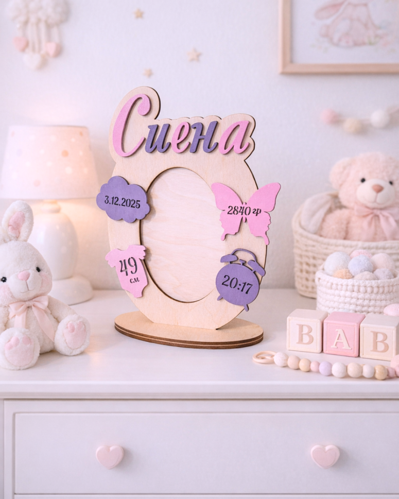 Тази бебешка рамка визитка е изработена от екологичен шперплат и е специално създадена за момиченце. Украсена е с нежни, момичешки елементи (като цветя, пеперуди, сърчица и др.), а изрязаните букви могат да бъдат оцветени в цвят по ваш избор – розово, бяло, златисто или всяка друга пастелна гама, която подхожда на детската стая.